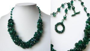 This necklace was wrapped in sterling silver wire. It can be wrapped in Artistic Wire, which is a silver coated copper wire having an anti-tarnish finish which has a lower cost. The chain uses more pearls with a sterling silver clasp.